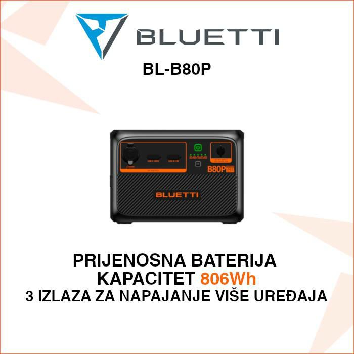 Bluetti B80P je visokokvalitetna prijenosna baterija kapaciteta 806 Wh. Temelji se na LiFePO4 tehnologiji, poznatoj po iznimnoj sigurnosti, dugotrajnosti i stabilnosti, s više od 3000 ciklusa punjenja do 80 % originalnog kapaciteta. Zahvaljujući svojoj modularnoj konstrukciji, B80P omogućuje fleksibilno proširenje sustava po potrebi – kapacitet može porasti do ukupno 1.3 kWh kad se koristi zajedno s kompatibilnim uređajem – Bluetti AC60P prijenosnom baterijskom stanicom.
