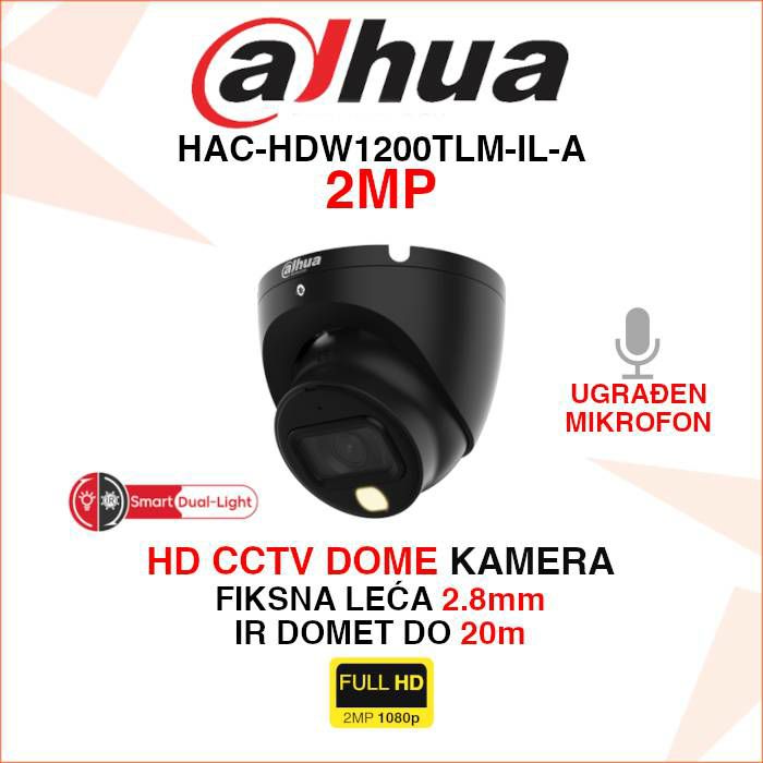 DAHUA 2MP HD CCTV DOME KAMERA U CRNOJ BOJI HAC-HDW1200TLM-IL-A
