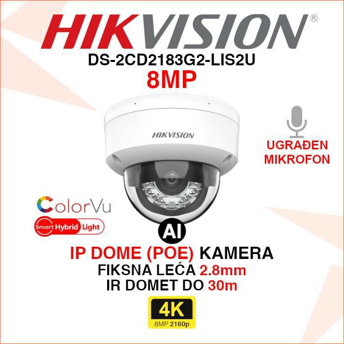 DS-2CD2183G2-LIS2U 4K AcuSense Smart Hybrid Light IP dome kamera