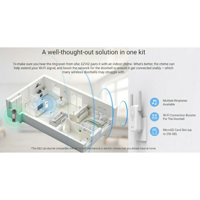 Kako biste bili sigurni da ćete čuti zvono čak i izdaleka, EZVIZ kamera za vrata dolazi s unutarnjim zvonom. Dodatno, unutarnje zvono može pomoći da pojačate WiFI signal kako bi se osigurala stabilnija veza s kamerom na vratima.