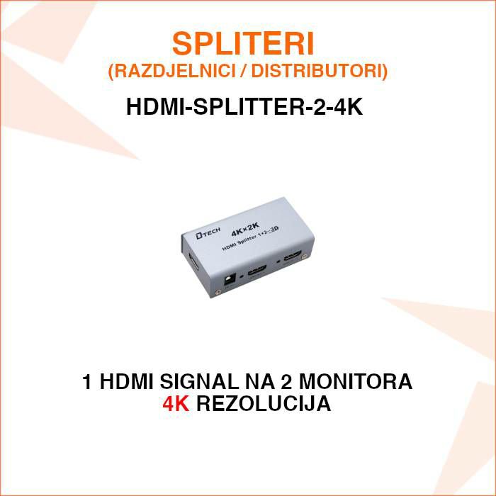 • 1 ista slika na 2 monitora • 1x HDMI ulaz 4K • 2x HDMI izlaza 4K • podržani audio formati: DTS-HD/Dolby-trueHD/LPCM7.1/DTS/Dolby-AC3/DSD/HD (HBR) • maksimalna udaljenost do monitora: 25m • napajanje: DC 5V