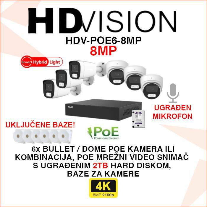 Komplet za video nadzor HDV-POE6-8MP uključuje: