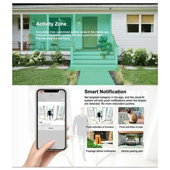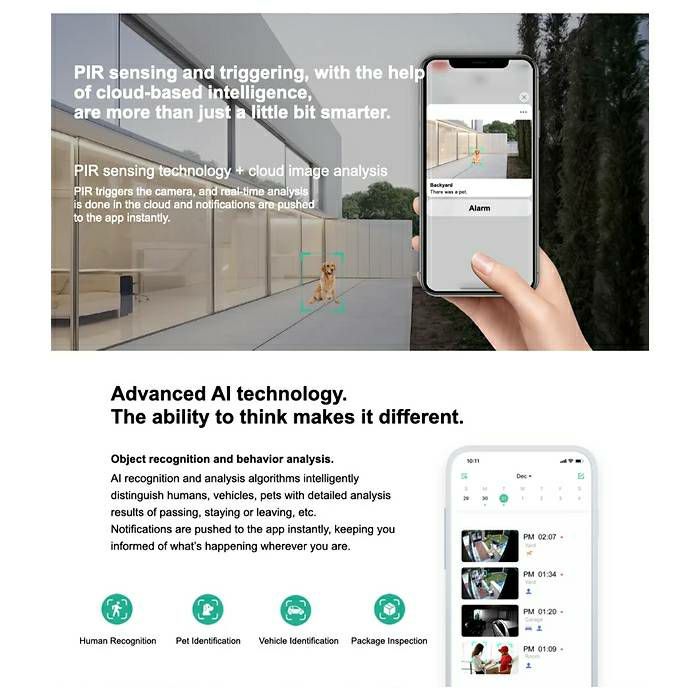 Koristeći nadograđeni Al algoritam i PIR senzor, ova bežična sigurnosna kamera omogućuje poboljšano prepoznavanje ljudi kako bi se smanjili lažni alarmi. Kamera vam šalje upozorenja u stvarnom vremenu kada otkrije kretanje.