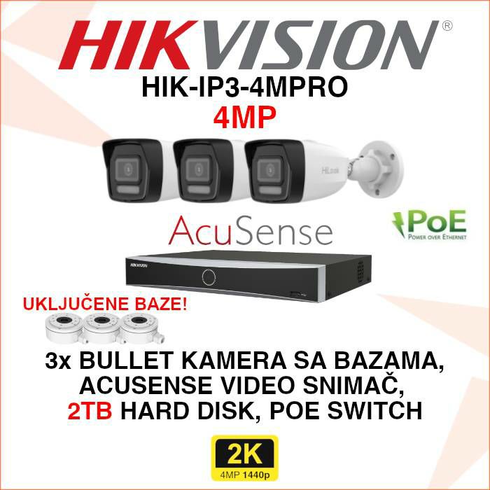 Komplet za video nadzor HIK-IP3-4MPRO uključuje: