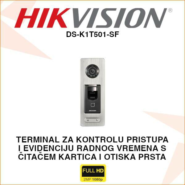 HikVision samostojeći terminal za kontrolu pristupa i evidenciju radnog vremena s čitačem otiska prsta i MIFARE kartica, omogućava ovlaštenim osobama ulaz/izlaz u objekte ili različita područja objekata sukladno programiranim pravilima. Uređaj ima dvostruku audio komunikaciju, 2MP kameru s IR i podržava pohranu do 3.000 otisaka. Mogućnost identifikacije na više načina (QR kod, kartica, otisak, kartica + otisak…).