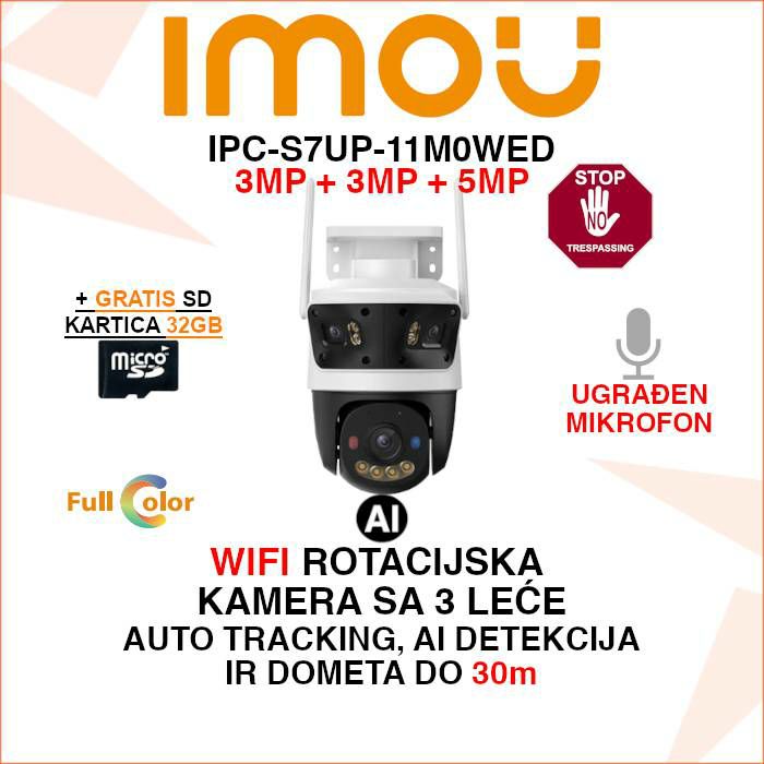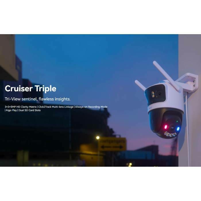 IMOU Cruiser Triple vanjska kamera nudi potpunu zaštitu zahvaljujući sustavu s tri leće – dvije širokokutne i jednom rotirajućom (pan–tilt) rezolucije ukupno 11 MP. Omogućuje pokrivanje svih kutova uz visoku kvalitetu slike danju i noću, s četiri načina noćnog snimanja (infracrveno, u boji, pametni i isključeno).