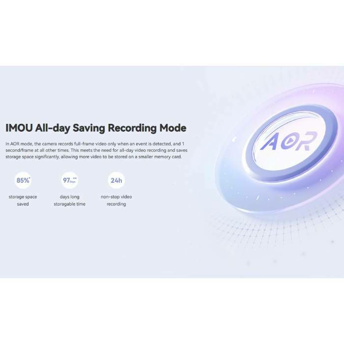 • AOR (Always on record) način snimanja – full-frame video snima se samo kad kamera detektira događaj; u ostalo vrijeme se snima samo 1 okvir u sekundi, čime se značajno štedi memorija