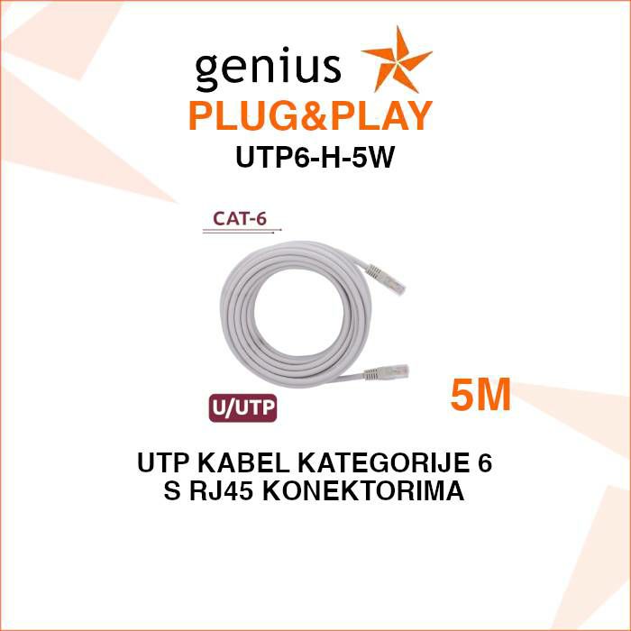 UTP6-H-5W je gotov Ethernet kabel klase Cat 6 s dužinom od 5 metara i kućištem bez halogena (LSZH). Ovaj kabel je izravno spreman za ugradnju i spajanje mrežnih uređaja, poput kamera, switcheva, rutera i drugih IP sustava, bez potrebe za dodatnim puštanjem kabela.