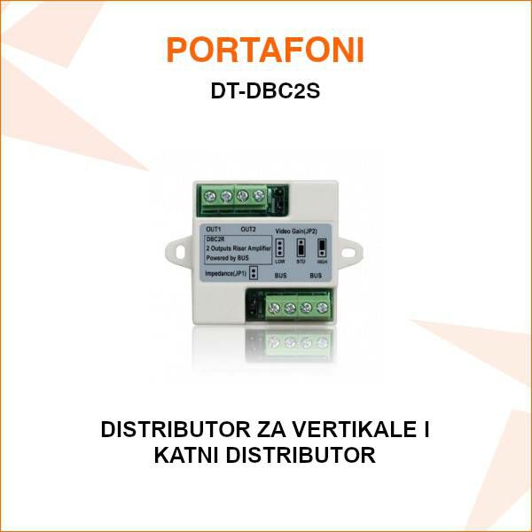 Distributor za interfonske sustave. Za povezivanje 2 vanjske jedinice u sustav ili katni distributor za unutarnje jedinice (monitor i slušalice) sa 2 izlaza. + distributor za vertikale u zgradi.